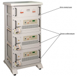 • состоит из трех однофазных силовых блока, блок коммутации, двухрамной 19″-стойки;